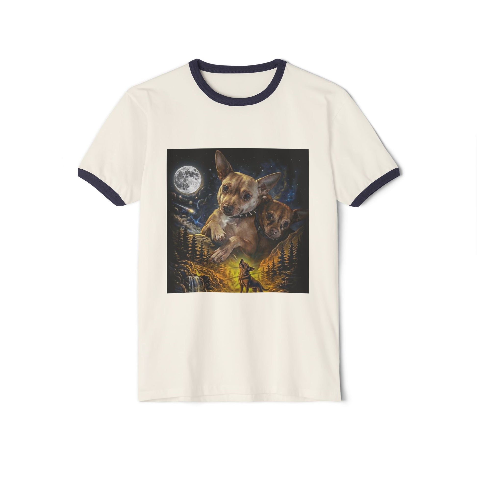 A soft, vintage-inspired ringer tee that brings moonlit wilderness scenes to your everyday rotation. The contrasting collar and sleeve trim frame a detailed forest design—chihauhaus beneath a glowing full moon and a lone camper on a trail—so the shirt reads like a small, wearable story. Lightweight and breathable, it layers easily under jackets or stands alone on warmer evenings. The cut is classic and relaxed, so it moves with you whether you’re heading out for a night hike, gathering around a campsite, or lounging at home with a mug and a good map.